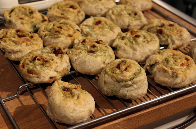 5. Smør på et lag med pesto, spre utover soltørka tomater og dryss over med litt revet ost.